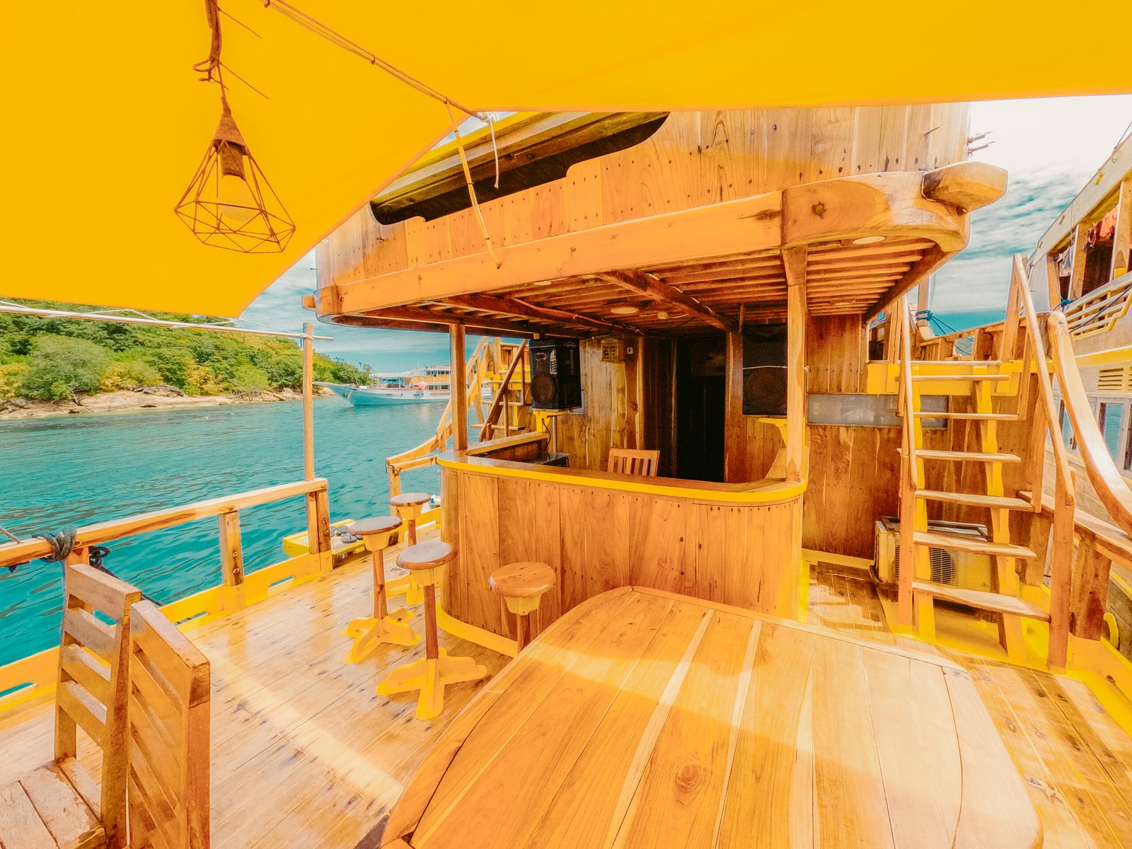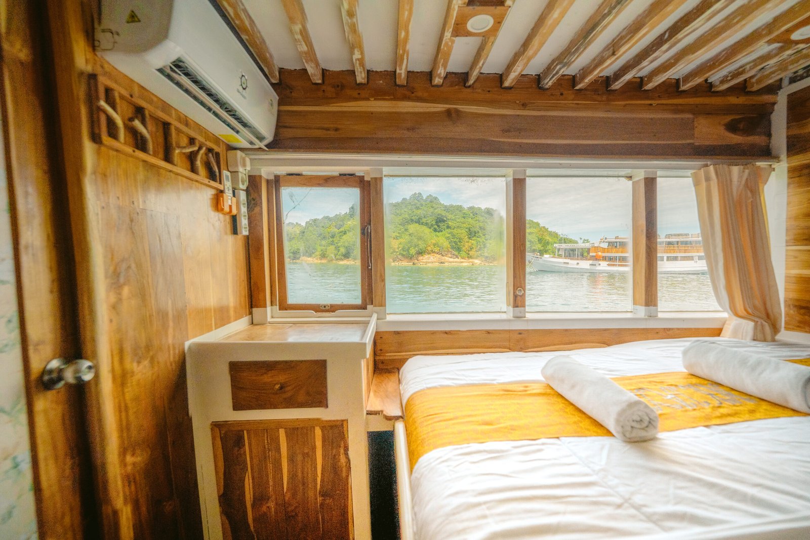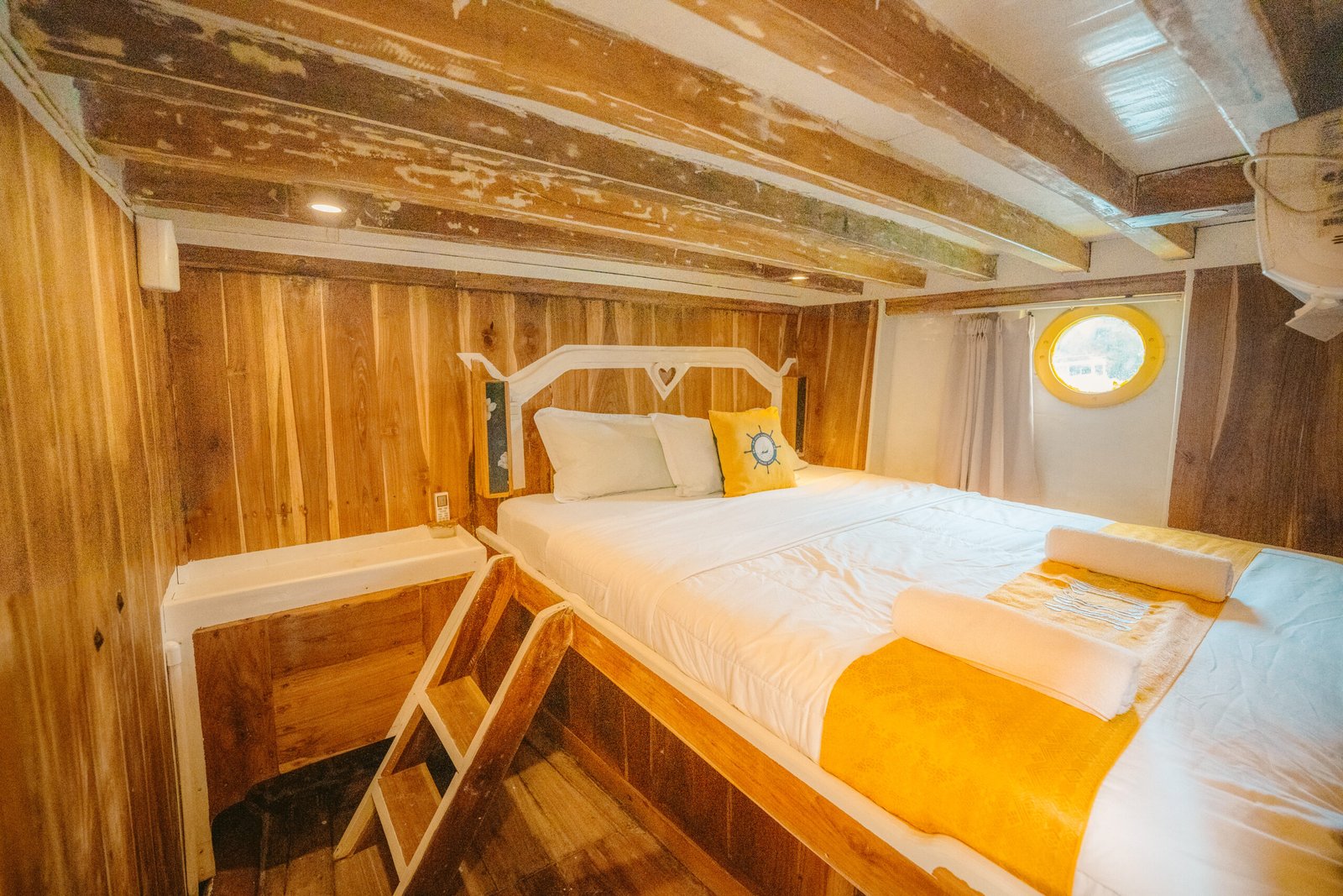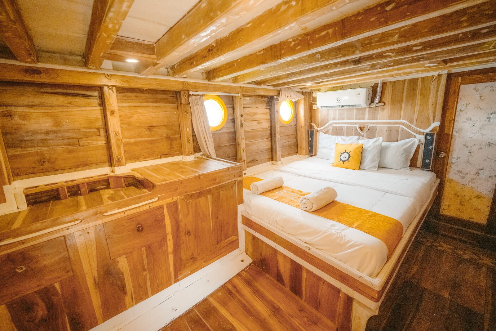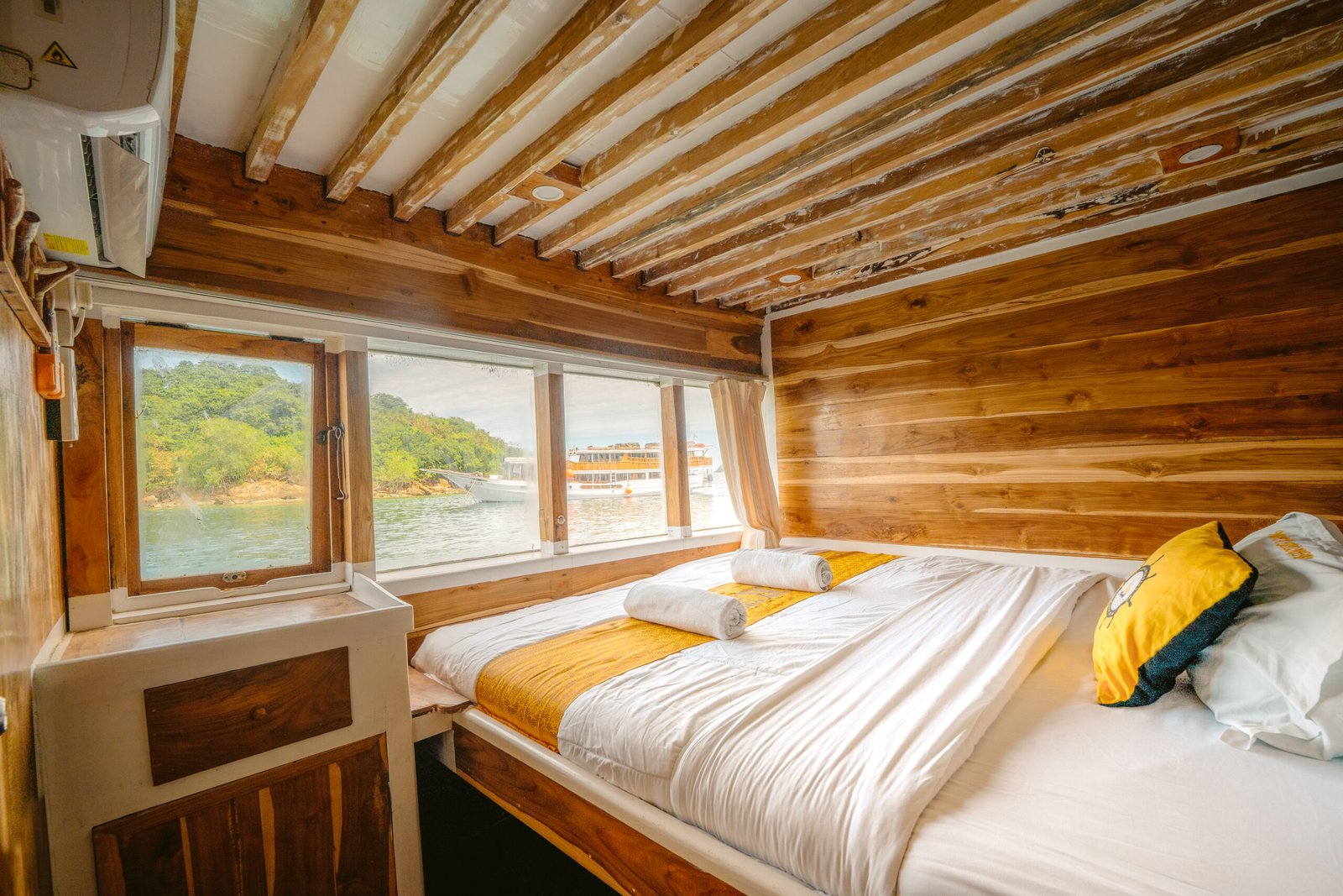 NK Jaya 1 boat has 7 AC cabin with queen bed and private bathroom to accommodate up to 14 guests.  Have 2 relax areas in outdoor with a comfortable soft bean bags and sofa, Jacuzzi at the sun deck area complete you to explores the sea during your open trip Komodo.